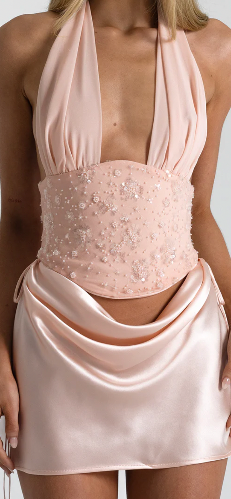 The Bronte Top features a ruched georgette halter neckline with a curved under-bust detail, lace-up eyelet fastening, and complimentary waist shaping for a flattering fit. The Evelyn Mini Skirt is crafted from bias-cut silk with a draped waistline and French seams, creating a smooth, elegant silhouette. Designed to connect together with inner loops and silk ties, this handcrafted Australian set offers a refined, cohesive look.